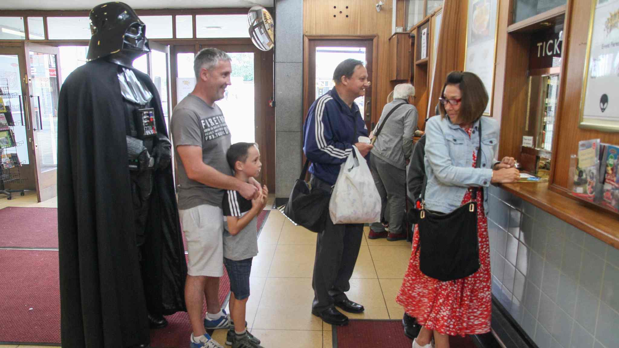 An actor dressed as Darth Vader from Star Wars waited in line, stunning one of the passengers who was about to buy a ticket. /VCG Photo