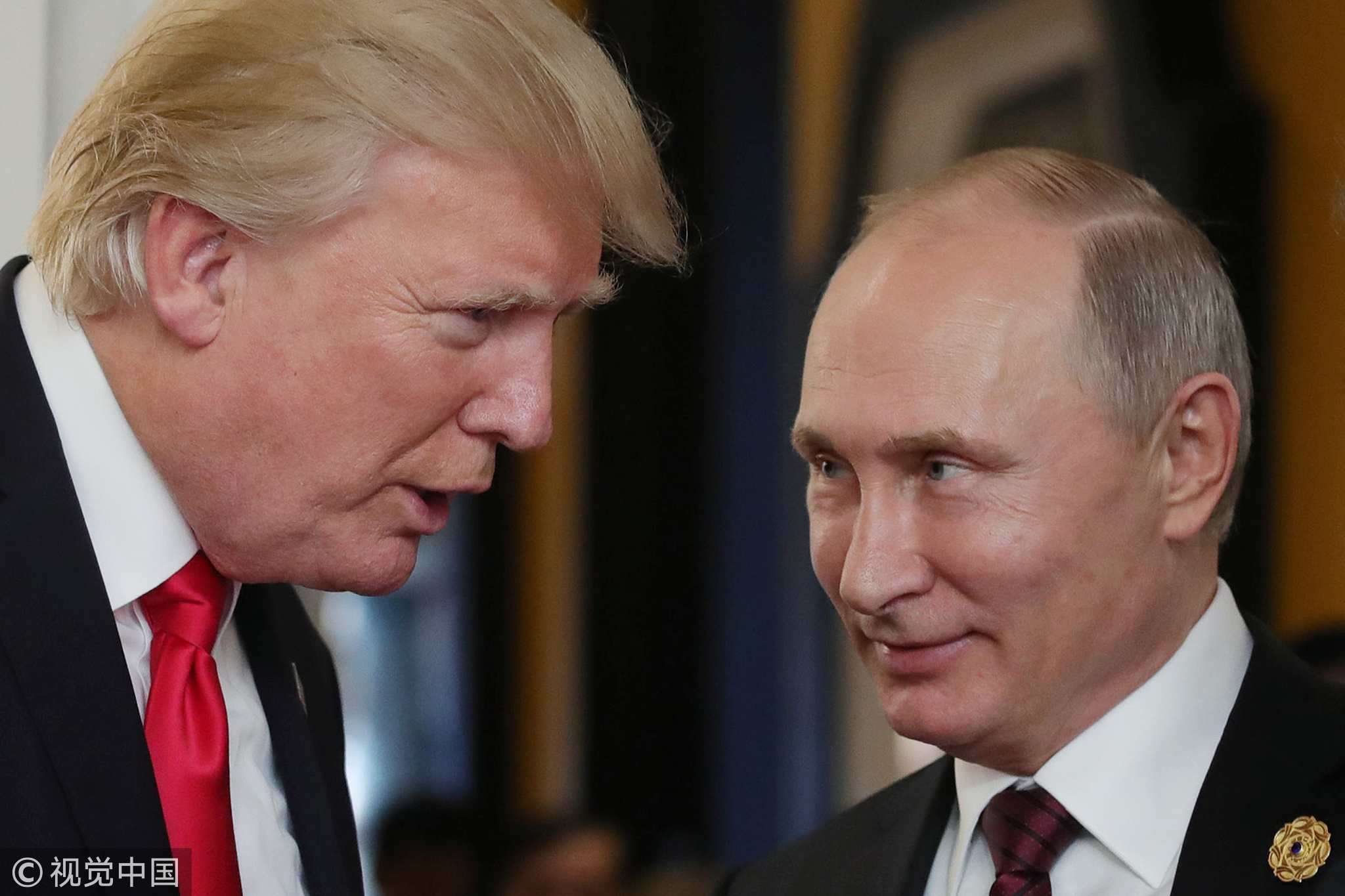 US President Donald Trump (L) chats with Russia's President Vladimir Putin at the APEC Economic Leaders' Meeting in the central Vietnamese city of Danang on November 11, 2017. /VCG Photo