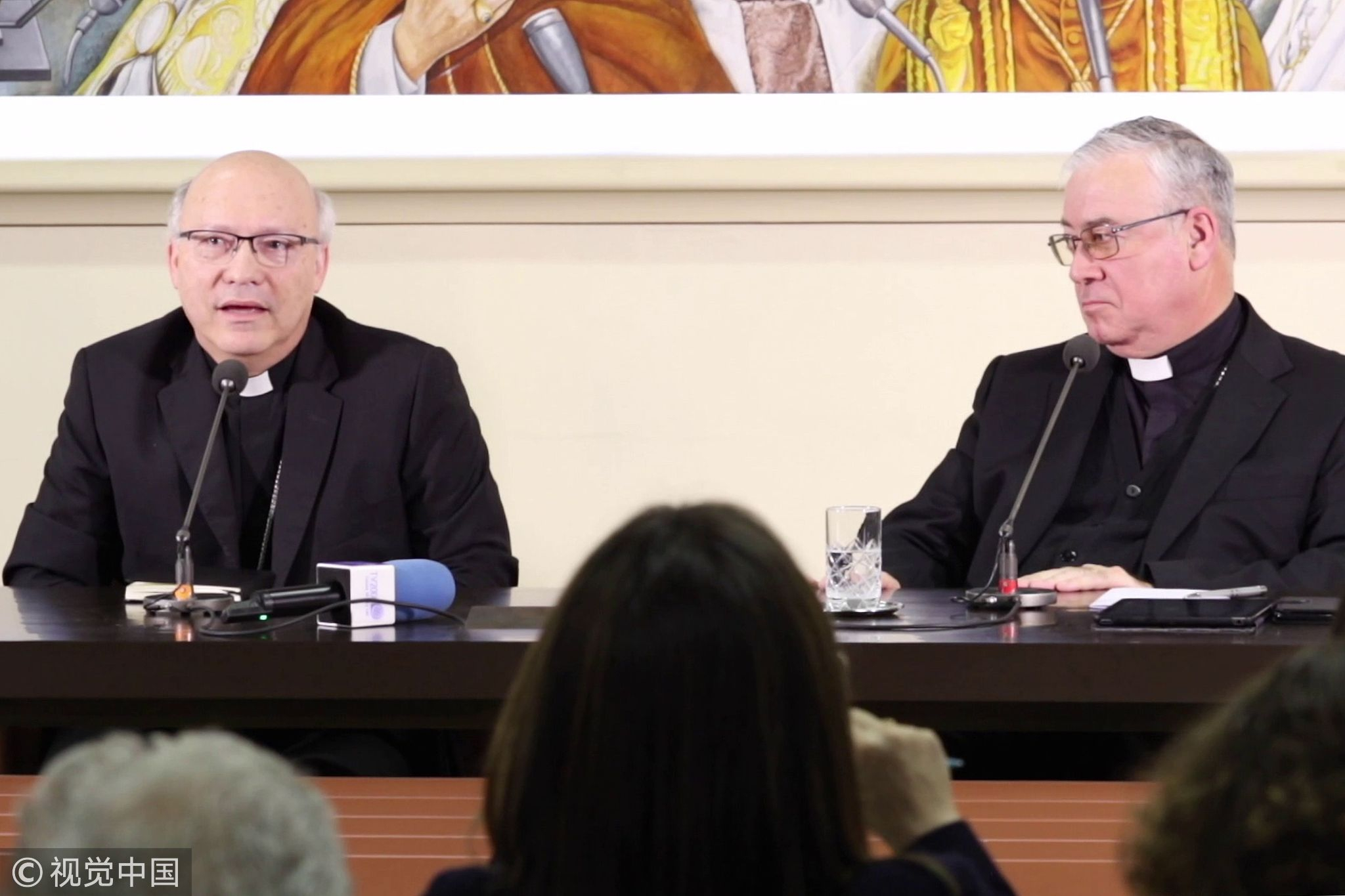 In this video grab members of Chile's bishops conference, Luis Fernando Ramos Perez (L) and Juan Ignacio Gonzalez give a press conference on May 14, 2018, in the Vatican. /VCG Photo.