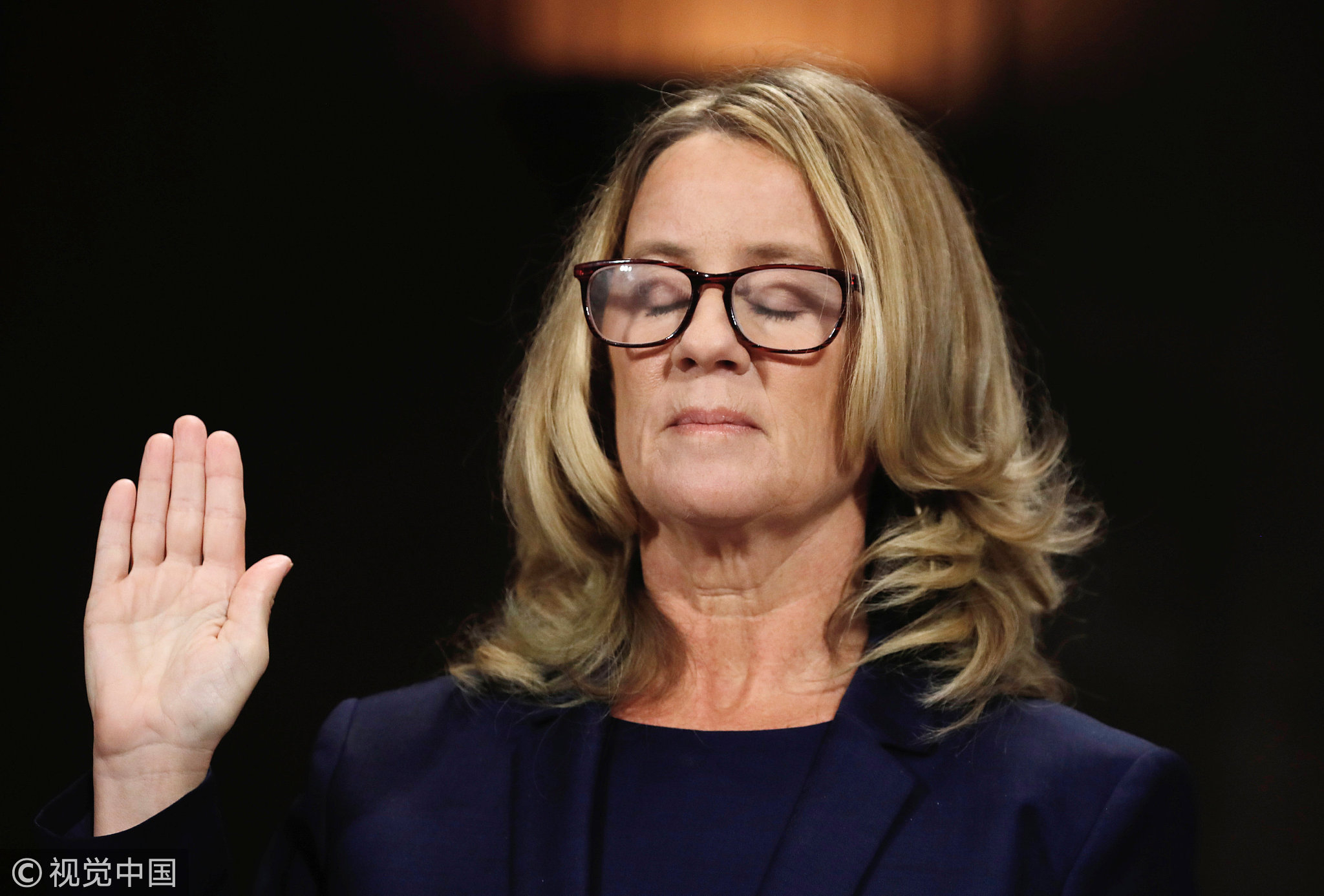 Christine Blasey Ford closes her eyes as she is sworn in before testifying to the Senate Judiciary Committee confirmation hearing for President Donald Trump's Supreme Court nominee Judge Brett Kavanaugh on Capitol Hill in Washington, US, September 27, 2018. /VCG Photo