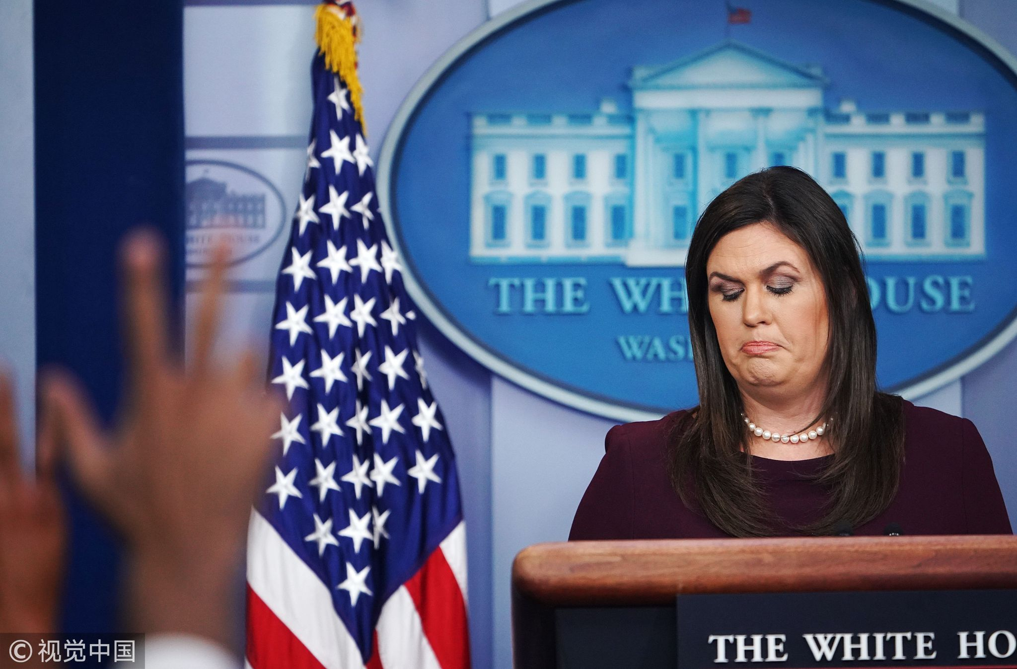 White House Press Secretary Sarah Sanders reacts during a briefing in the Brady Briefing Room of the White House in Washington, DC, October 3, 2018. /VCG Photo