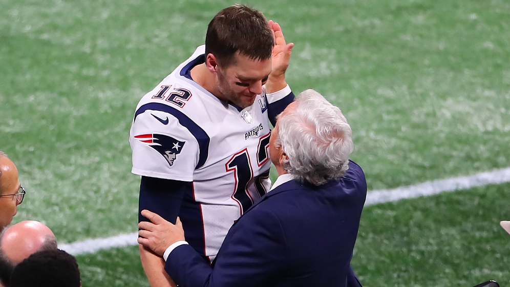 New England Patriots quarterback Tom Brady (L) chats with Robert Kraft prior to Super Bowl LIII, February 3, 2019. /VCG photo