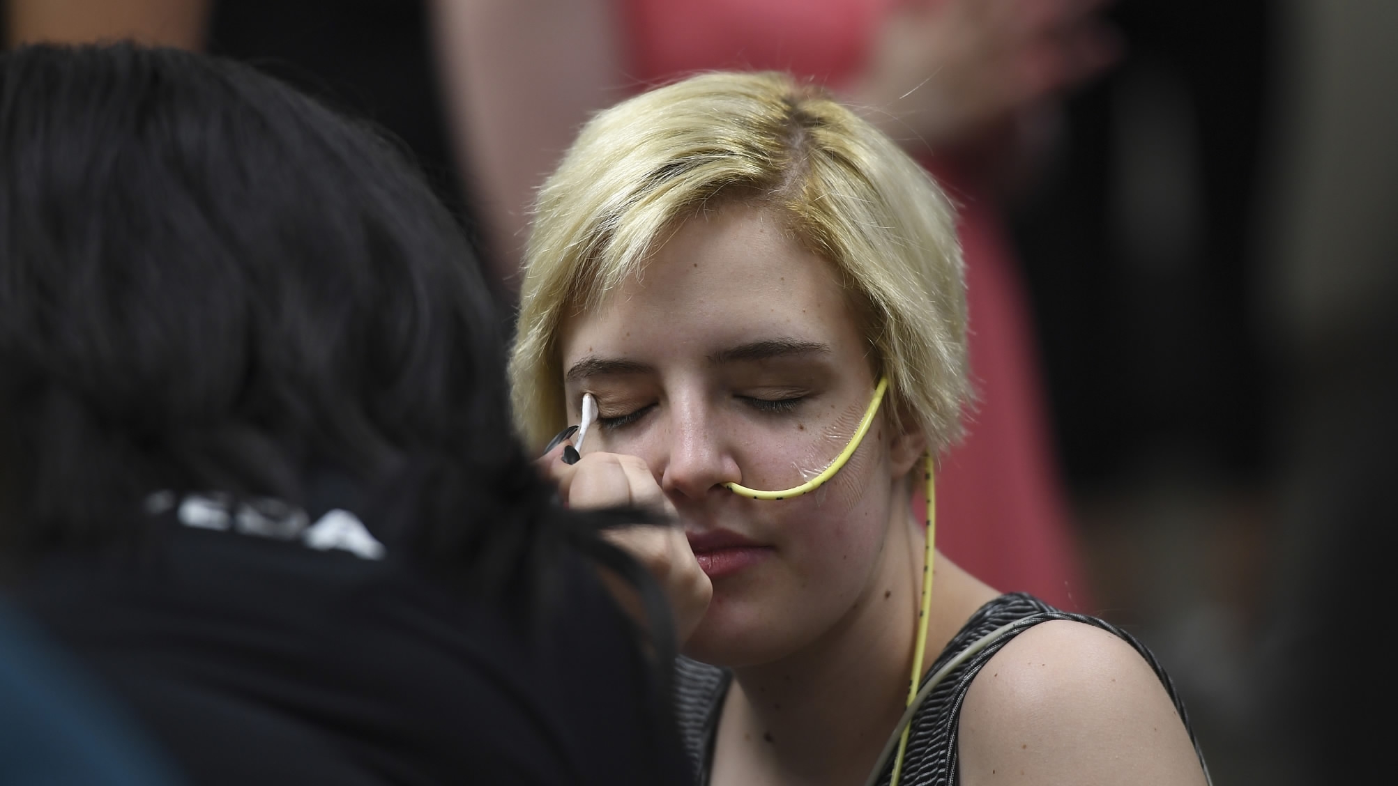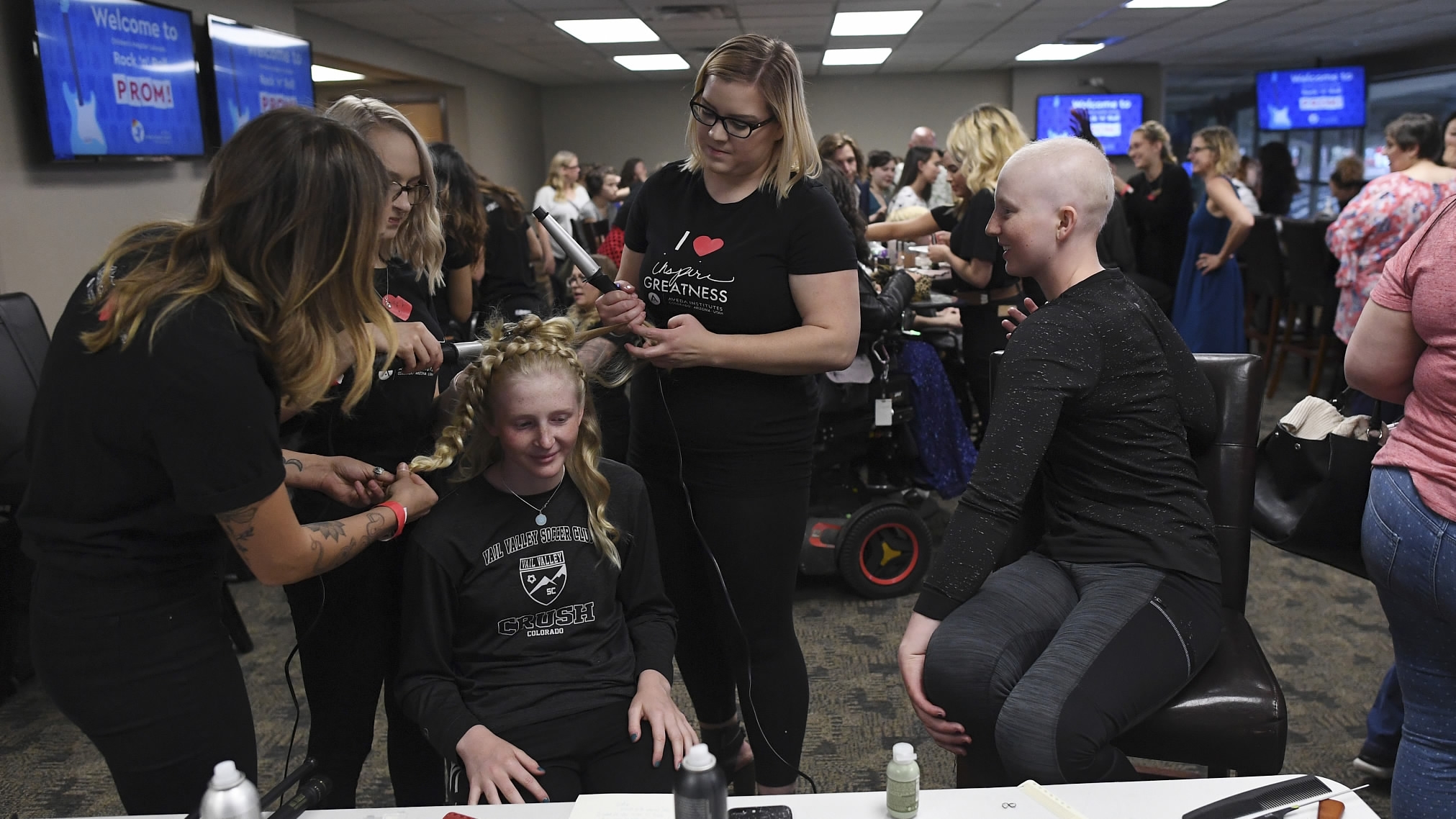Champbell Sullivan, 16, who is battling cancer, was watching her sister, Addie, the guest of Champbell, get hair and make-up done before the prom. /VCG Photo