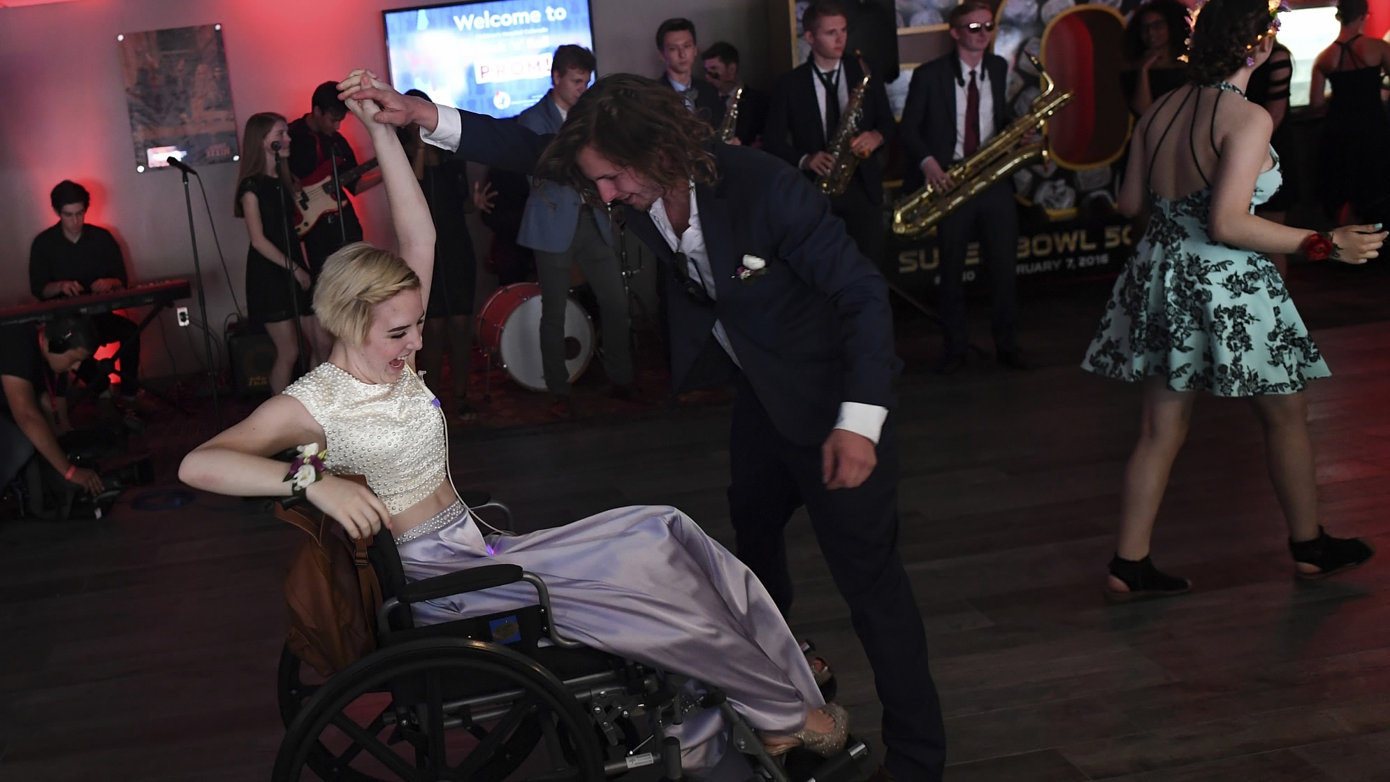 Hailey Hooper, 16, who has a functional neurological disorder and sternum deformity, was dancing with her older brother at the prom. /VCG Photo