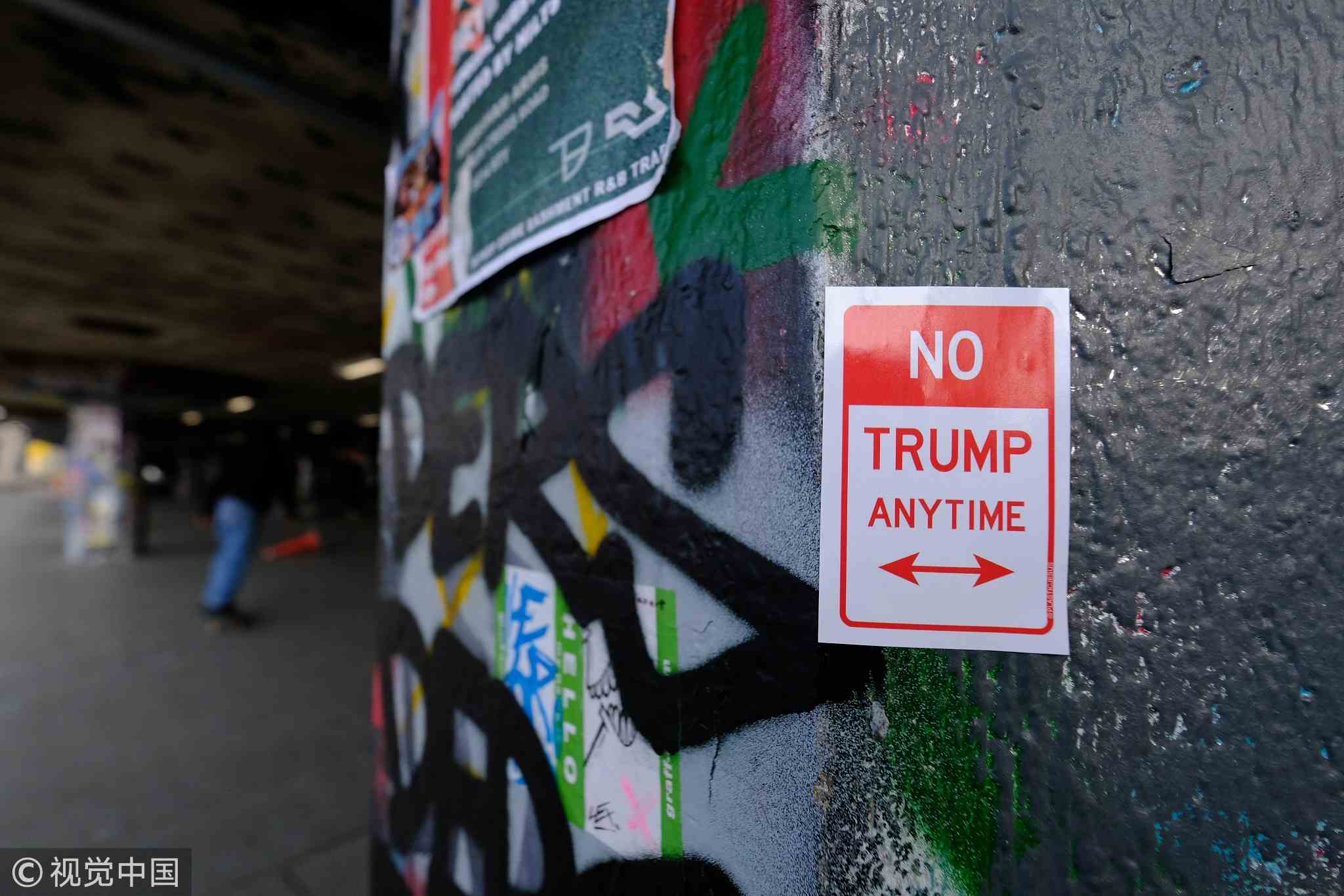 A "No Trump Anytime" sticker is pictured at the South Bank skate park in London, United Kingdom, on February 26, 2018. /VCG Photo