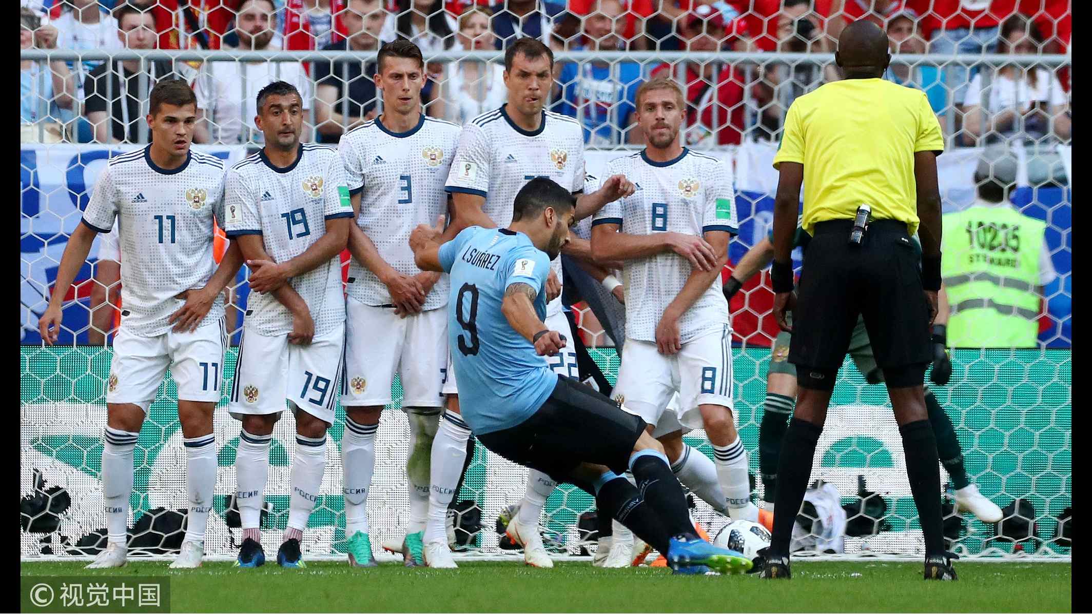 Uruguayan striker Luis Suarez scores the first goal from a free kick during the World Cup Group A match between Uruguay and Russia at the Samara Arena on June 25, 2018. /VCG Photo