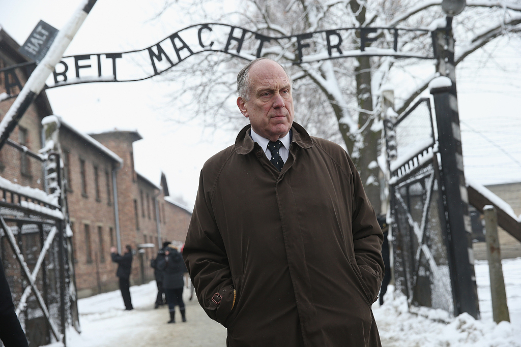 Ronald Lauder, the president of the World Jewish Congress, waits for the arrival of a group of Auschwitz survivors at the former Auschwitz I concentration camp, Oswiecim, Poland, January 26, 2015. /VCG Photo