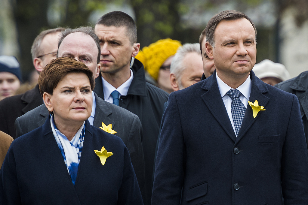 Polish President Andrzej Duda (R) attends the 73rd anniversary of the Warsaw Ghetto Uprising, which is the 1943 action of the Jewish resistance in German-occupied Poland, on April 19, 2016, in Warsaw, Poland. /VCG Photo