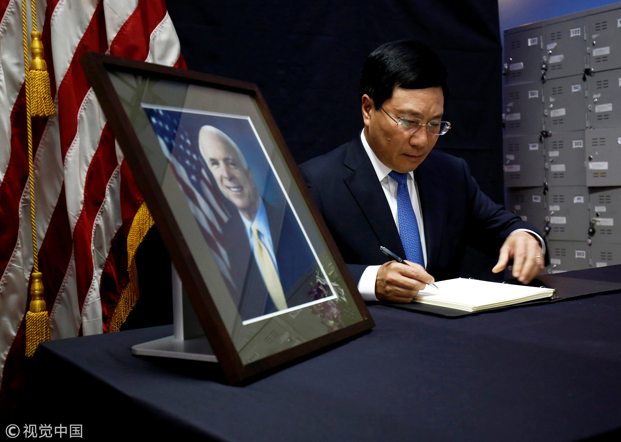Vietnam's Deputy Prime Minister and Foreign Minister Pham Binh Minh writes in a condolence book near a portrait of US Senator John McCain (R-AZ) about his death at the US embassy in Hanoi, Vietnam on August 27, 2018. /VCG Photo