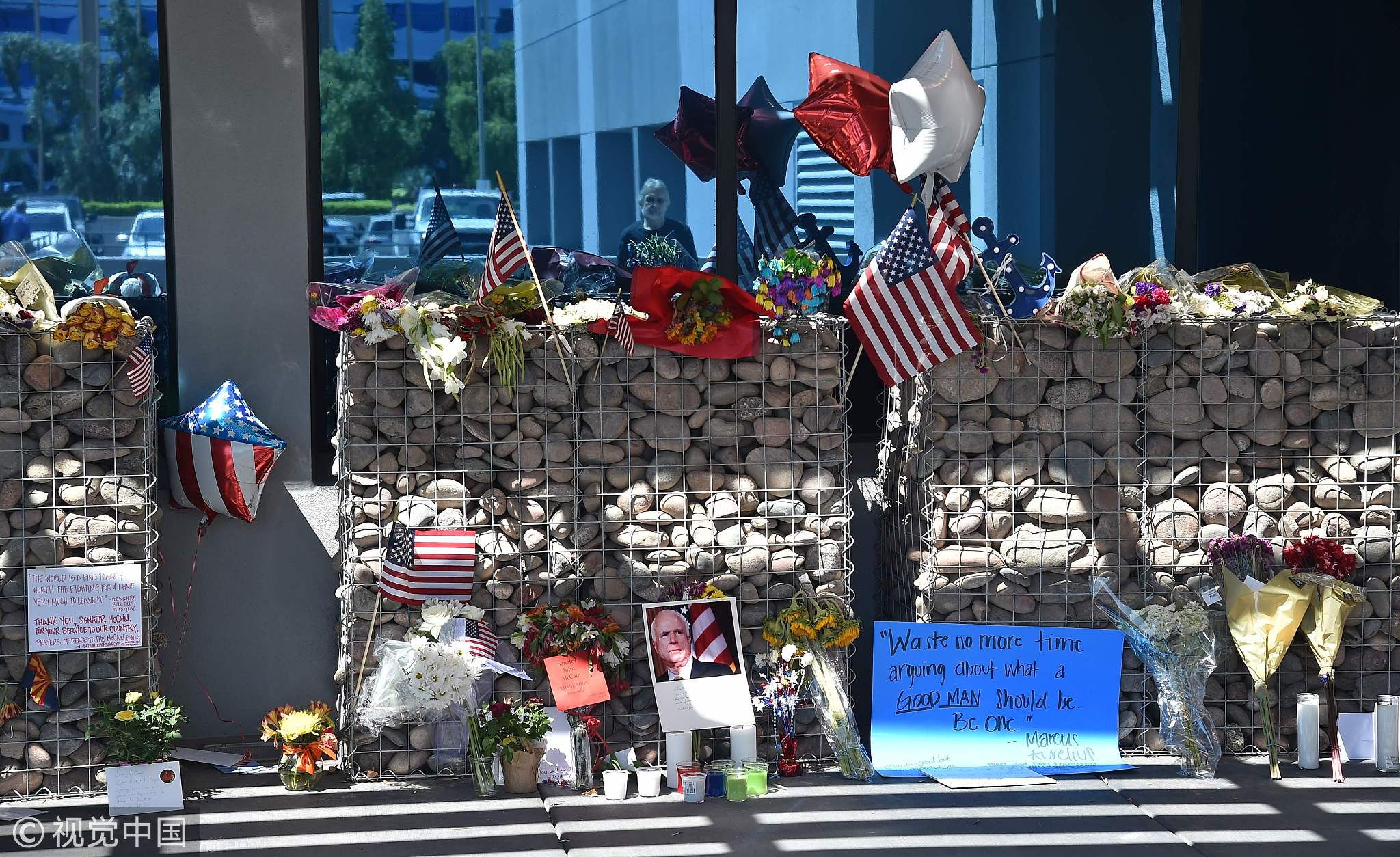 A passerby is reflected in glass as he contemplates makeshift memorial to Senator John McCain outside McCain's office in Phoenix, Arizona, August 27, 2018. /VCG Photo