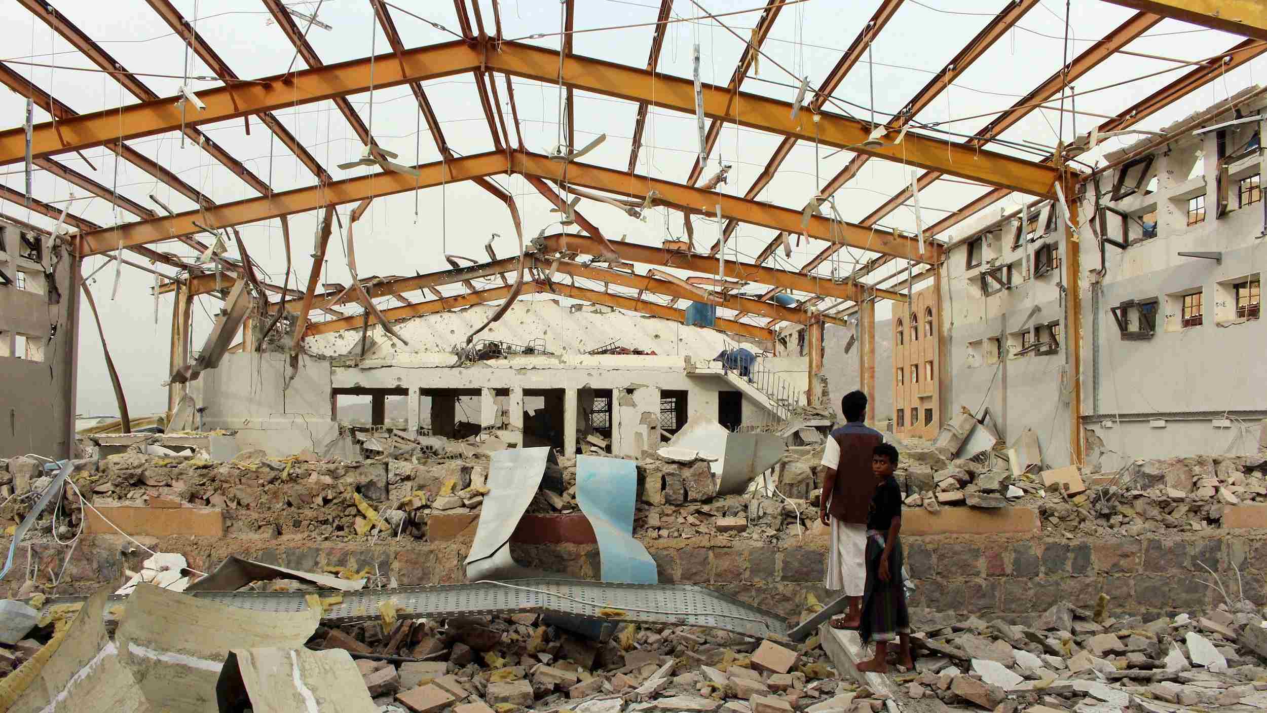Yemenis inspect the damage caused by a Saudi-led air strike on a cholera treatment center supported by Doctors Without Borders (MSF) in the Abs region of Yemen, June 11, 2018. /VCG Photo