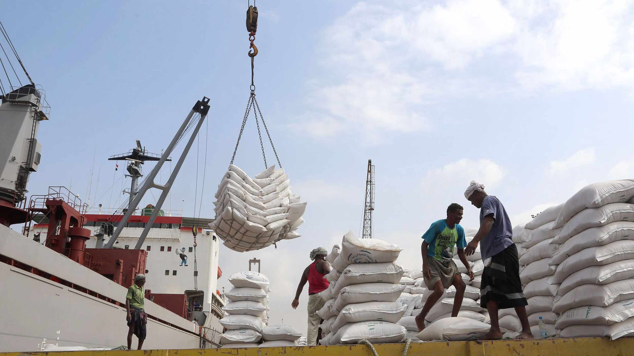Workers unload wheat assistance provided by UNICEF from a cargo ship in the Red Sea port of Hodeidah, a key entry point for United Nations aid to war-torn Yemen, January 27, 2018. /VCG Photo
