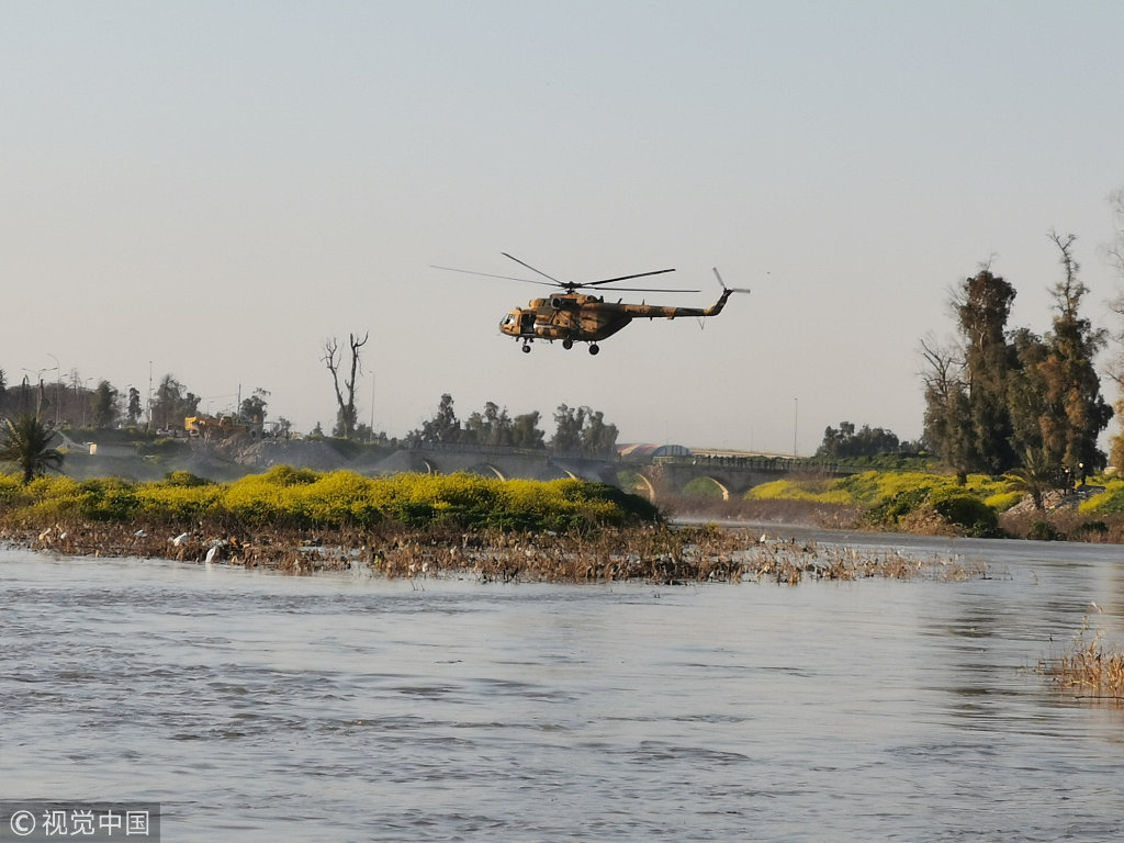 An Iraqi rescue helicopter searches for survivors in the Tigris river near Mosul, March, 21,2019. / VCG Photo