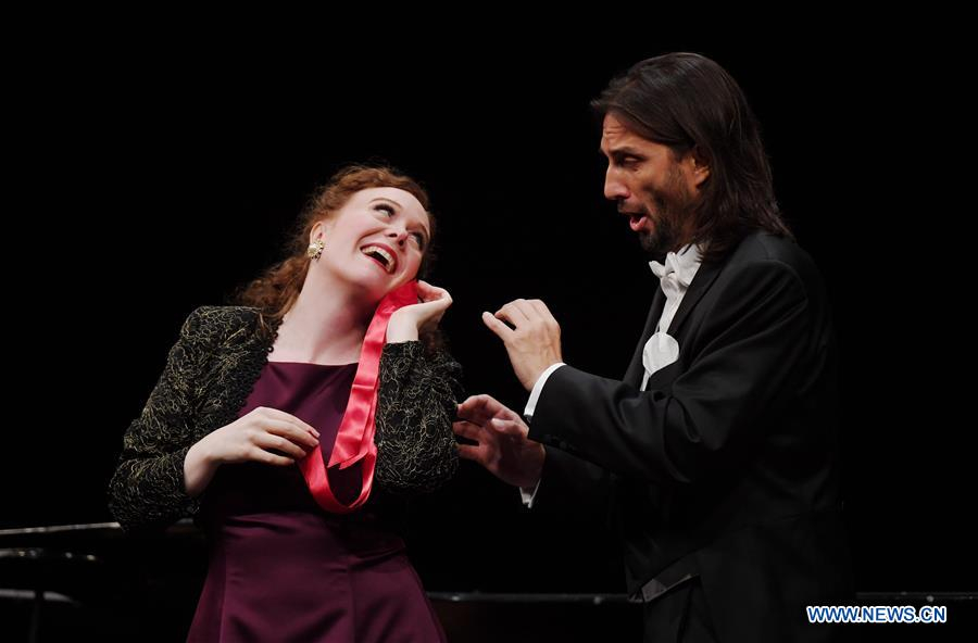 Morgan Harrington (L) and Andrea Zaupa sing a Chinese song at Herbst Theatre in downtown San Francisco, the United States, June 30, 2018. /Xinhua Photo