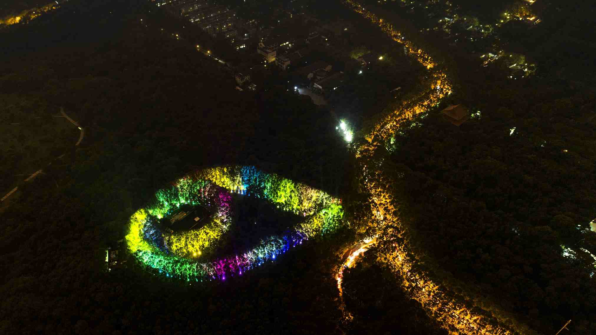 The Meiling Palace in Nanjing, east China’s Jiangsu Province, looks like a dazzling and huge necklace embedded in an emerald pendant from aerial photos taken on Sunday night. /VCG Photo