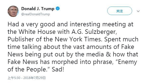 "Spent much time talking about the vast amounts of Fake News being put out by the media & how that Fake News has morphed into phrase, 'Enemy of the People.' Sad!"