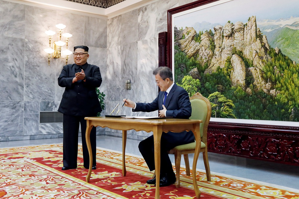 South Korean President Moon Jae-in (R) signs a guestbook as DPRK leader Kim Jong Un reacts before their meeting at the truce village of Panmunjom, May 26, 2018. /Photo via South Korea's Blue House