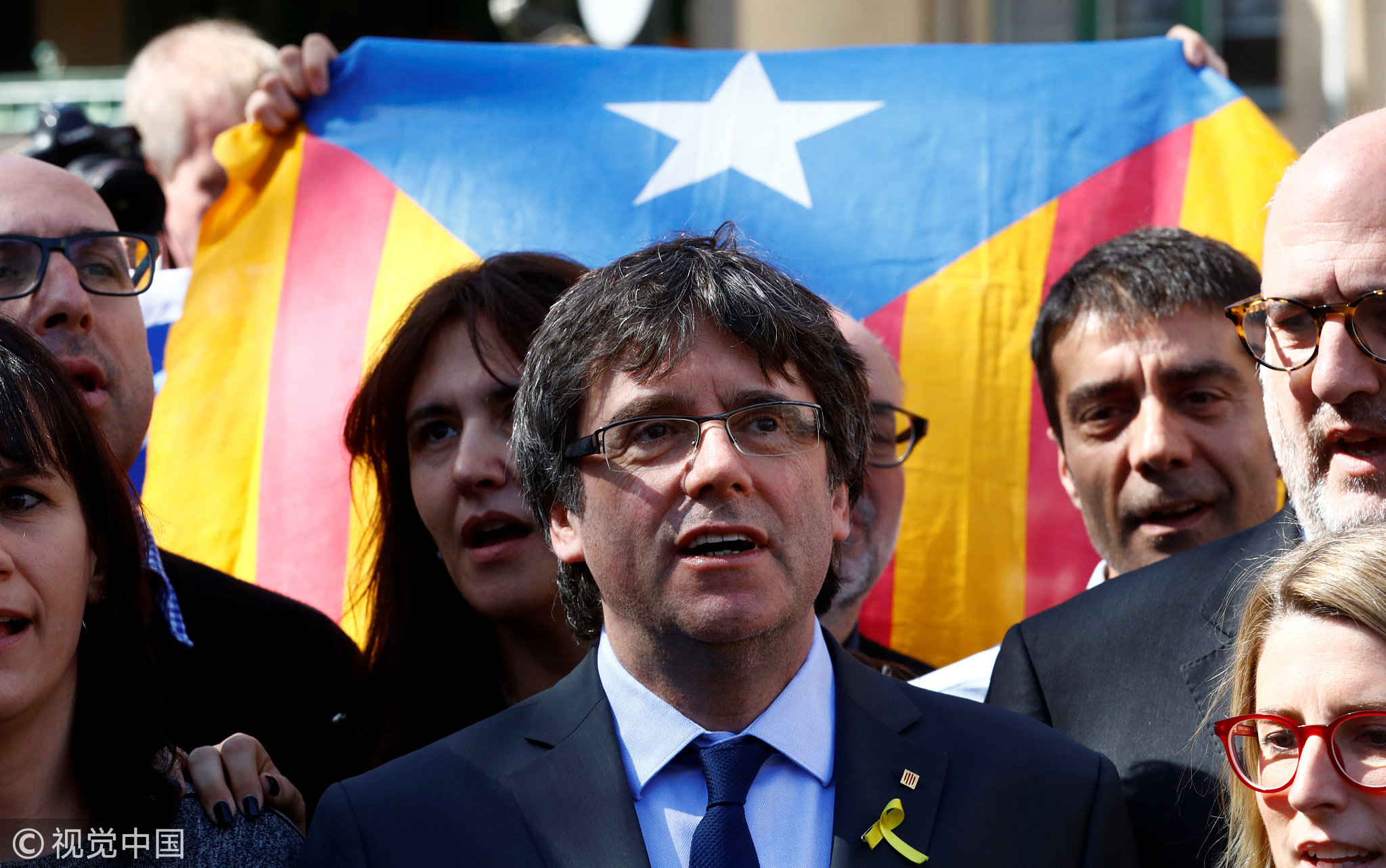 Catalonia's former leader Carles Puigdemont leaves a news conference in Berlin, April 7, 2018. /VCG Photo