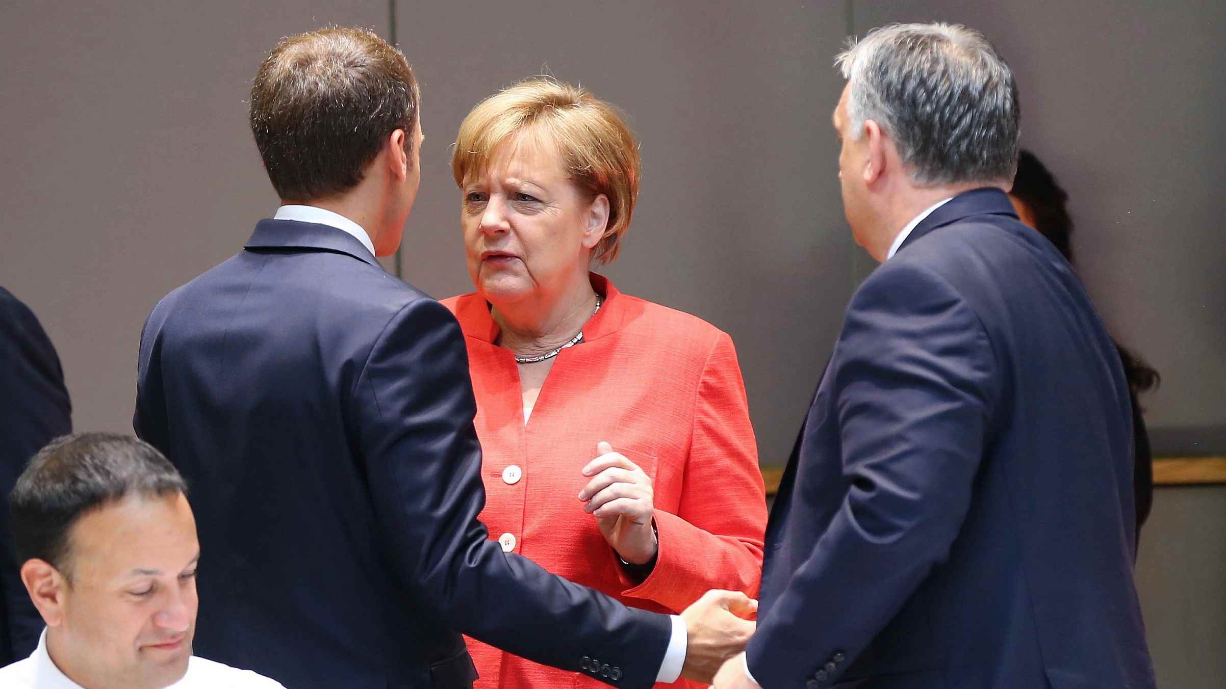 German Chancellor Angela Merkel (C) chats with President of France Emmanuel Macron (L) and Prime Minister of Hungary Viktor Orban (R) during the second day of the European Union Leaders' Summit in Brussels, Belgium on June 29, 2018. /VCG Photo