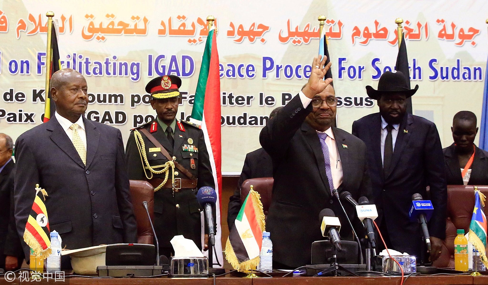 Sudanese President Omar Al-Bashir flanked by Ugandan President Yoweri Museveni and South Sudanese President Salva Kiir welcome delegates during a South Sudan peace meeting as part of talks to negotiate an end to a civil war, in Khartoum, Sudan, June 25, 2018. /VCG Photo