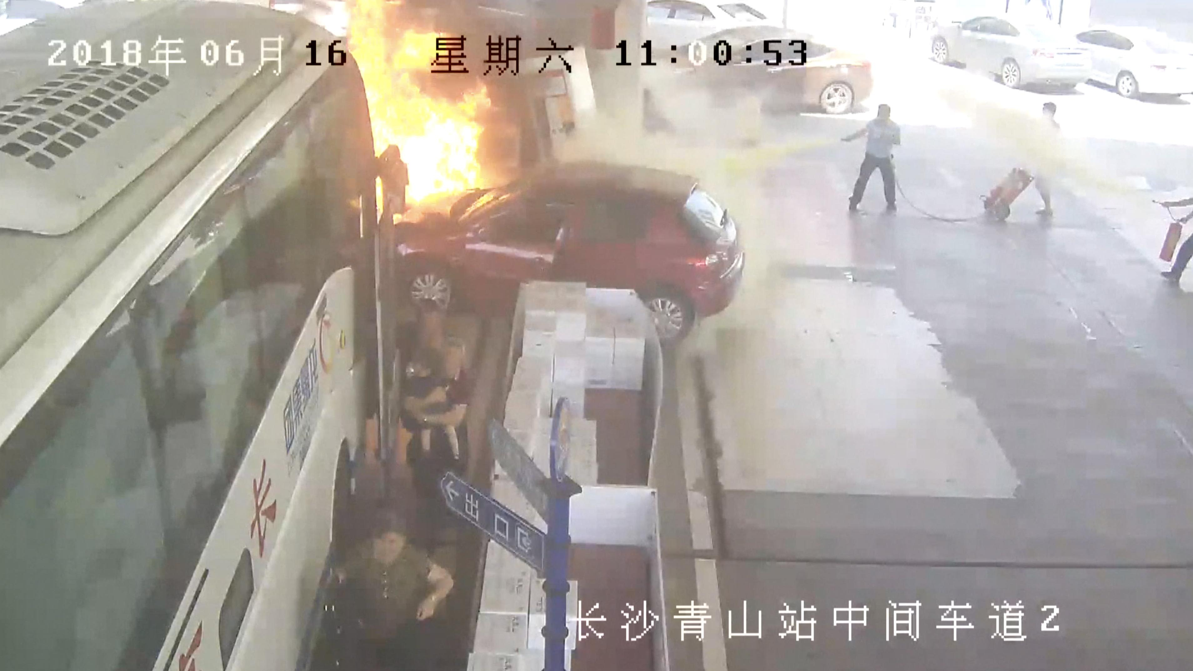 A red sedan hit a pump at a gas station and caught fire in central China’s Changsha City recently. Seven attendants put out the fire in less than 40 seconds, preventing a major disaster. They were rewarded with 800,000 yuan for their bravery. The gas station has since fully reopened.