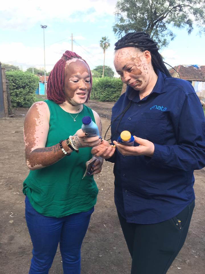 Wangui Njeeh (L) distributes sunscreens to people with vitiligo. /Photo via Facebook
