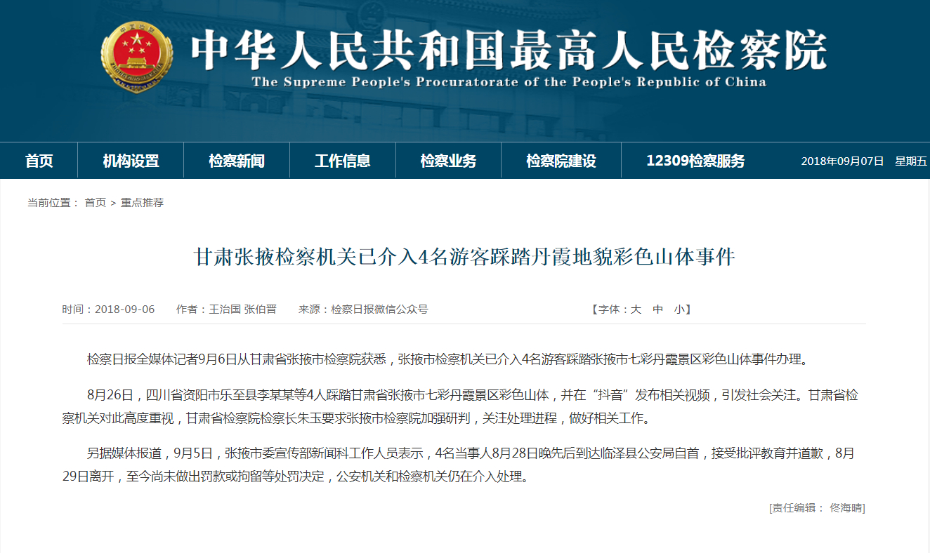 Though the four tourists are said to have voluntarily confessed their crime on August 28, the chief procurator of the Procuratorate of Gansu Province, Zhang Yu, has urged the procuratorate in the city of Zhangye where the incident happened to formally pursue the matter.