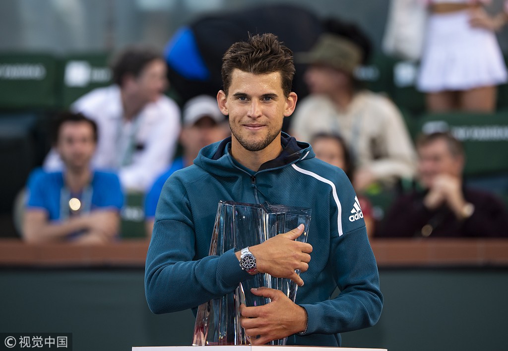 Dominic Thiem of Austria poses with the winner's trophy, after beating Roger Federer of Switzerland during the finals of the BNP Paribas Open at the Indian Wells Tennis Gardens in Indian Wells, California, U.S., March 17, 2019. /VCG Photo