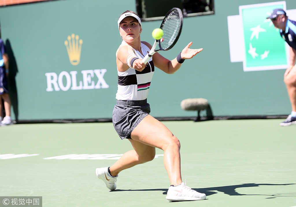 Bianca Andreescu of Canada hits a backhand during the finals of the BNP Paribas Open at the Indian Wells Tennis Gardens in Indian Wells, California, U.S., March 17, 2019. /VCG Photo