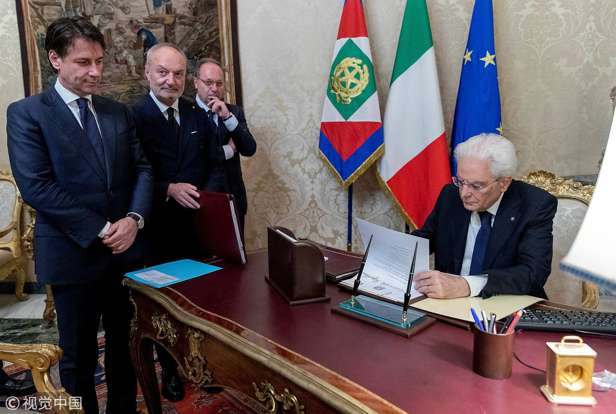 Italy's Prime Minister-designate Giuseppe Conte looks on as Italian President Sergio Mattarella signs documents at the Quirinal Palace in Rome, Italy, May 31, 2018. /VCG Photo