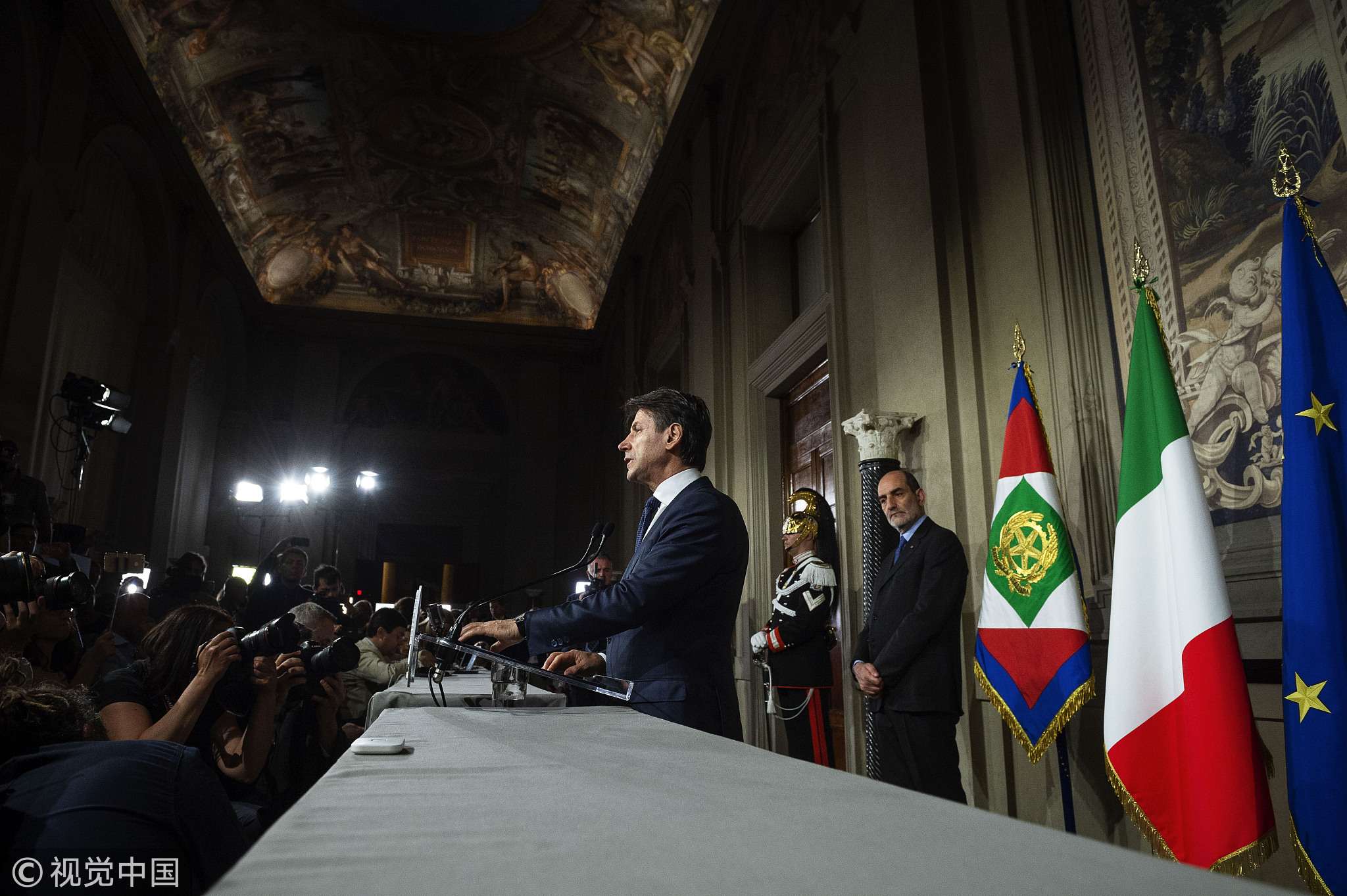 Law professor Giuseppe Conte, Italy's new prime minister-designate, speaks to the press to present his ministers list after being appointed by Italian President Sergio Mattarella on May 31, 2018, in Rome, Italy. /VCG Photo