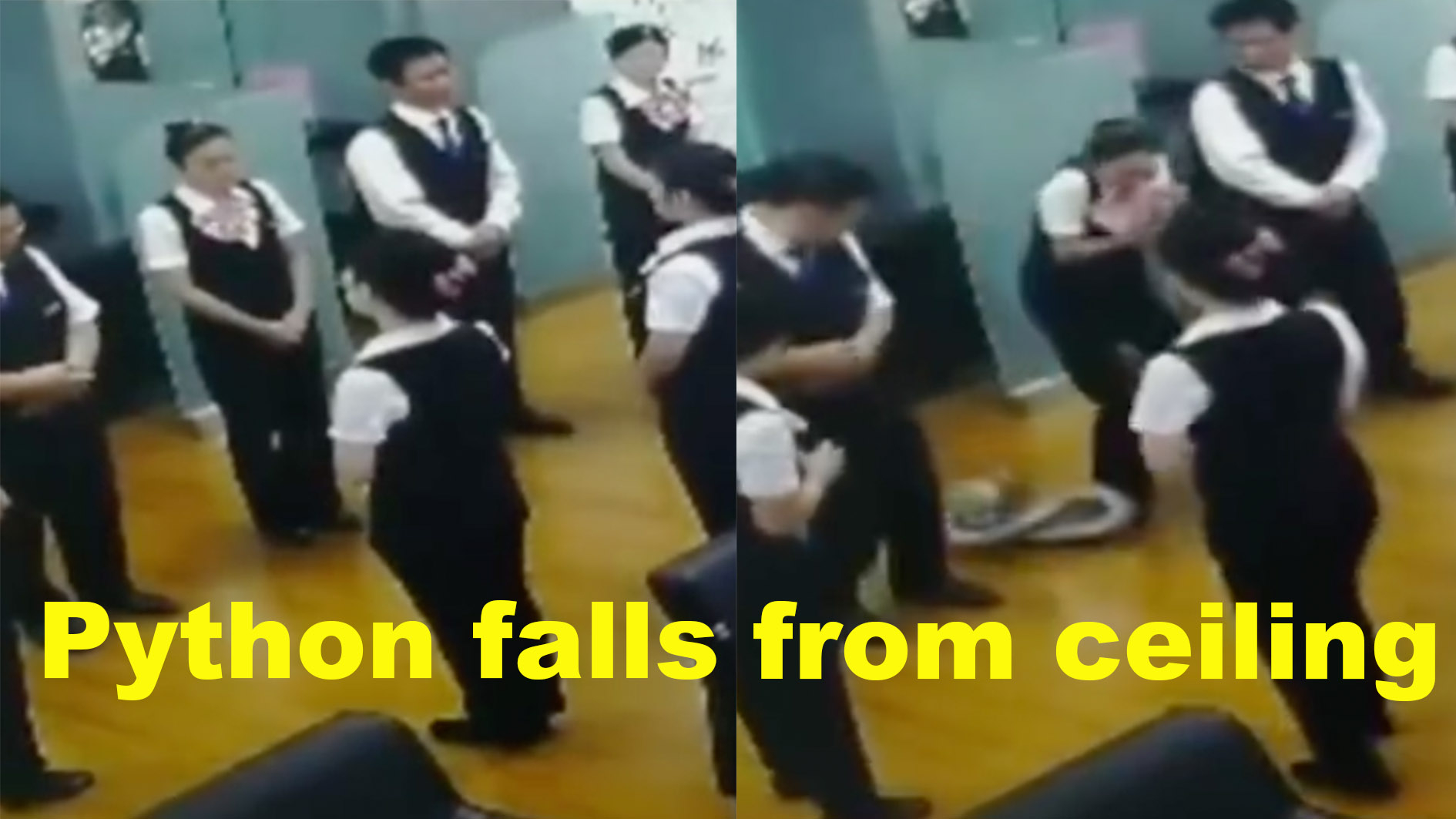 A morning staff meeting at a bank in Nanning City, south China's Guangxi Zhuang Autonomous Region, was interrupted by a six-feet long python that suddenly fell from the ceiling on Friday. Wildlife protection staff soon arrived to capture the python. Police said they're investigating where it came from. Luckily, no one was hurt.