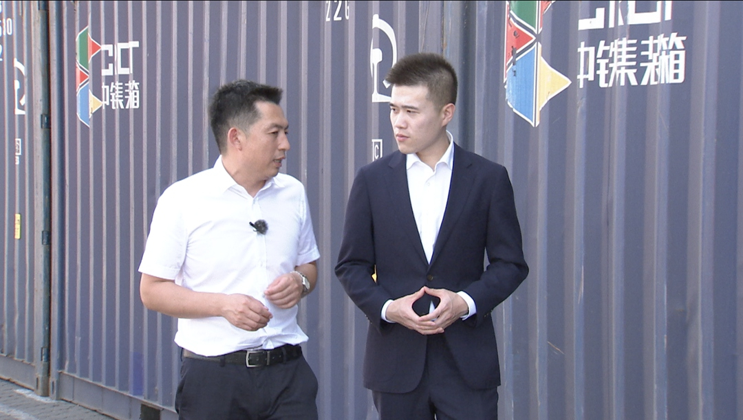Yuan Zhenhe [L], the vice general manager for Liaoning Shen-Ha & Hongyun Railway Logistics, explains to a CGTN reporter that each 20-foot container can hold 20 tons of Russian crops, which amount to a total of 2,000 tons for a fully loaded train. /CGTN Photo