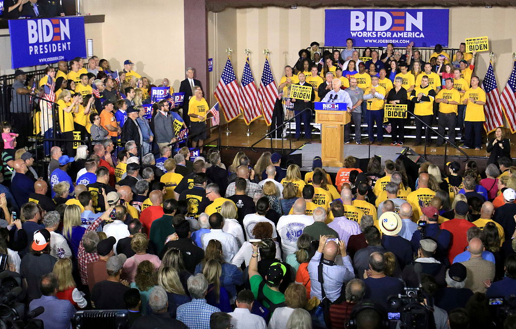 Joe Biden speaks to union members during a visit to a union hall in Pittsburgh, Pennsylvania, April 29, 2019. /VCG Photo