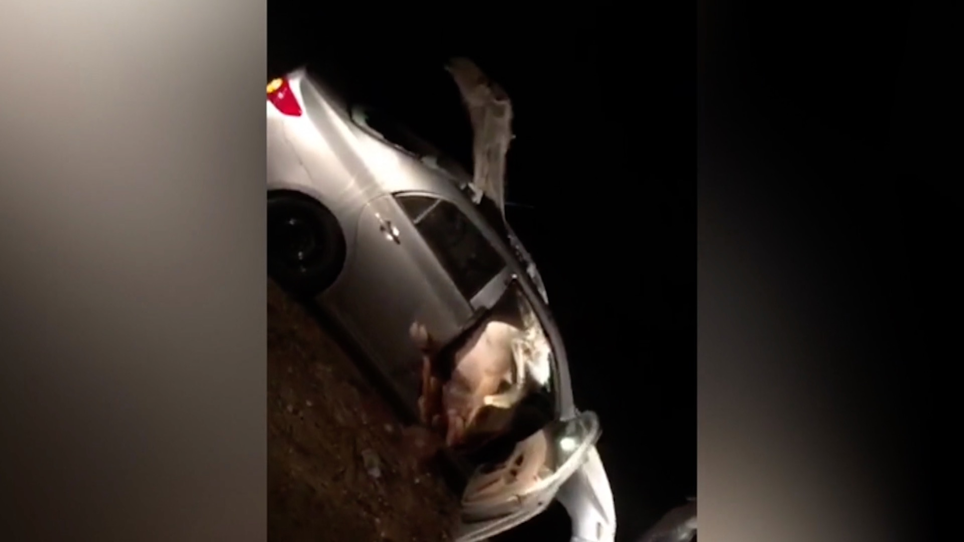 This is the bizarre moment a camel became trapped inside a car after a head-on collision. Like a scene from Jurassic Park, the terrified animal writhes as its head sticks out of the sunroof. The driver escaped unharmed and the animal was later freed.