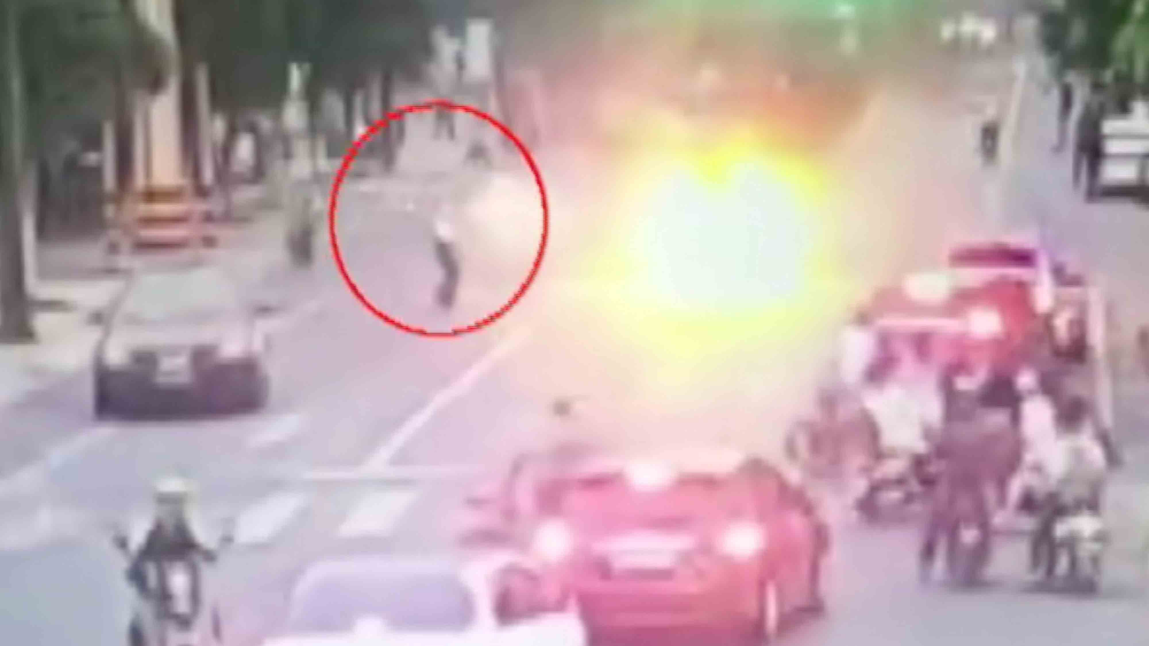 A car driving down a busy street spontaneously burst into flames. A traffic officer rushed to the scene to put out the fire in Lianyungang City, east China's Jiangsu Province, on May 29.