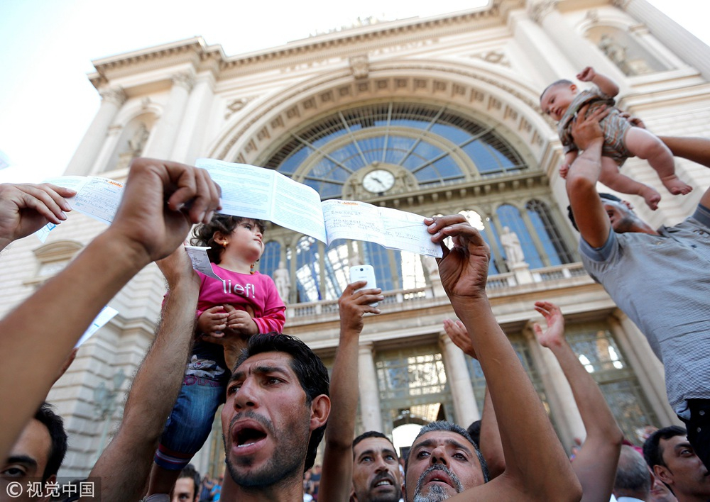 September 1, 2015: Migrants wave their train tickets and lift up children outside the main Eastern Railway station in Budapest, Hungary. /VCG Photo