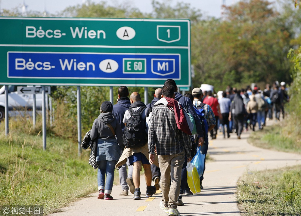 September 12, 2015: Migrants walk on a road towards the crossing point between Hungary and Austria in Nickelsdorf. /VCG Photo