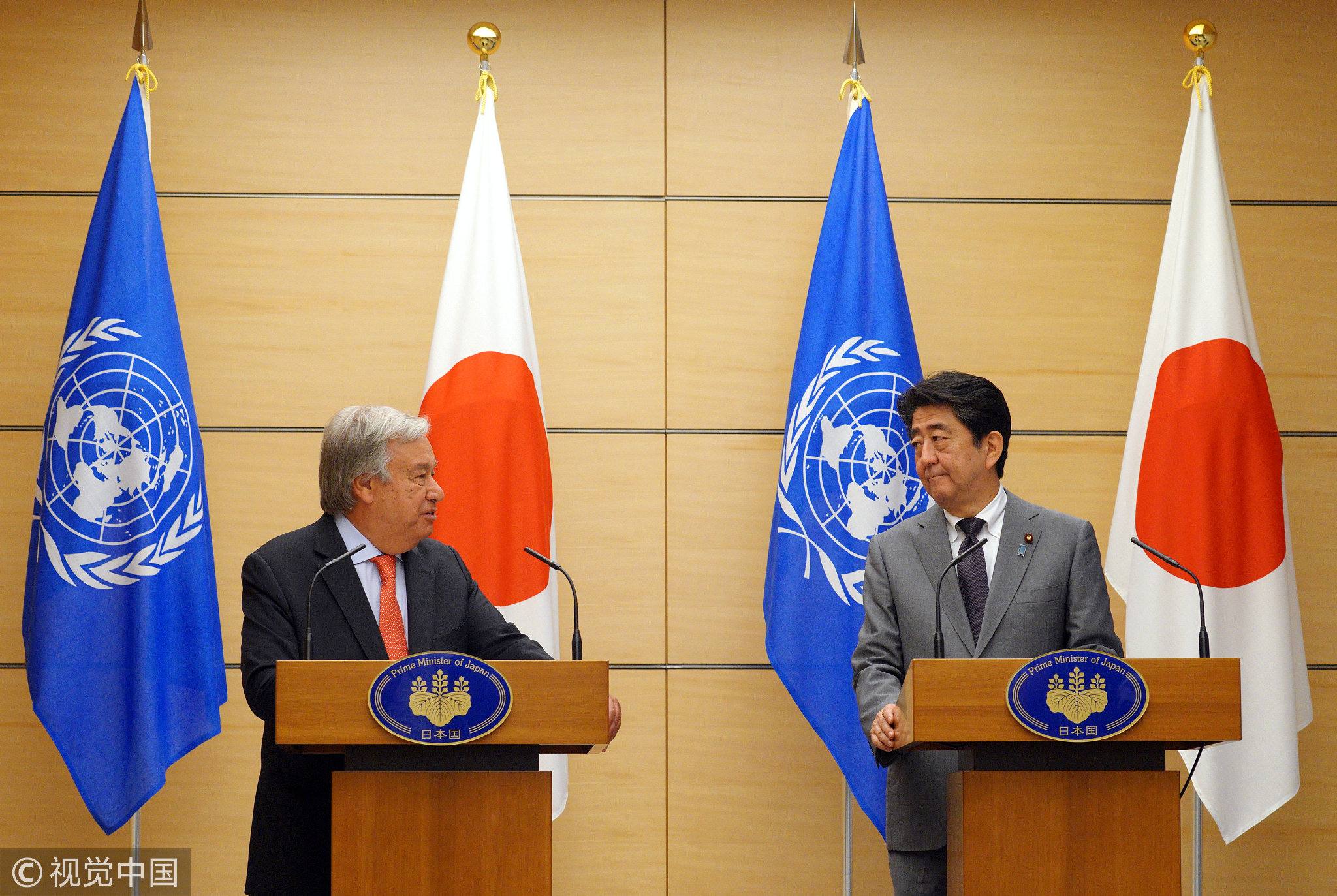 United Nations Secretary General Antonio Guterres and Japanese Prime Minister Shinzo Abe attend their joint news conference at the prime minister's office in Tokyo, Japan, August 8, 2018. /VCG Photo