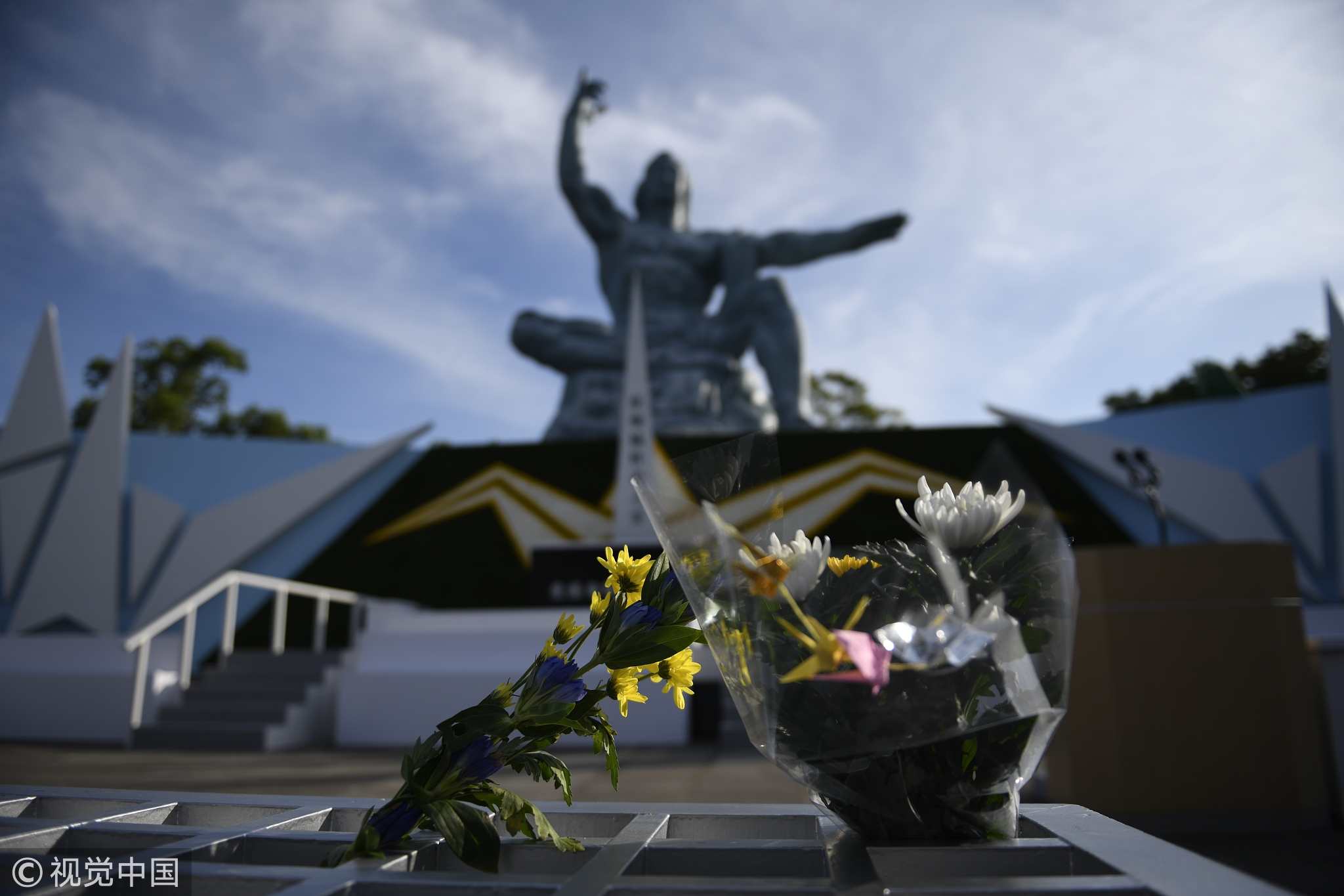 Flowers lays by visitors are seen in front of the Nagasaki Peace Park in Nagasaki, southern Japan, August 9, 2018 during the 73rd anniversary of the second atomic bomb that was dropped by the United States on Nagasaki on August 9, 1945. /VCG Photo