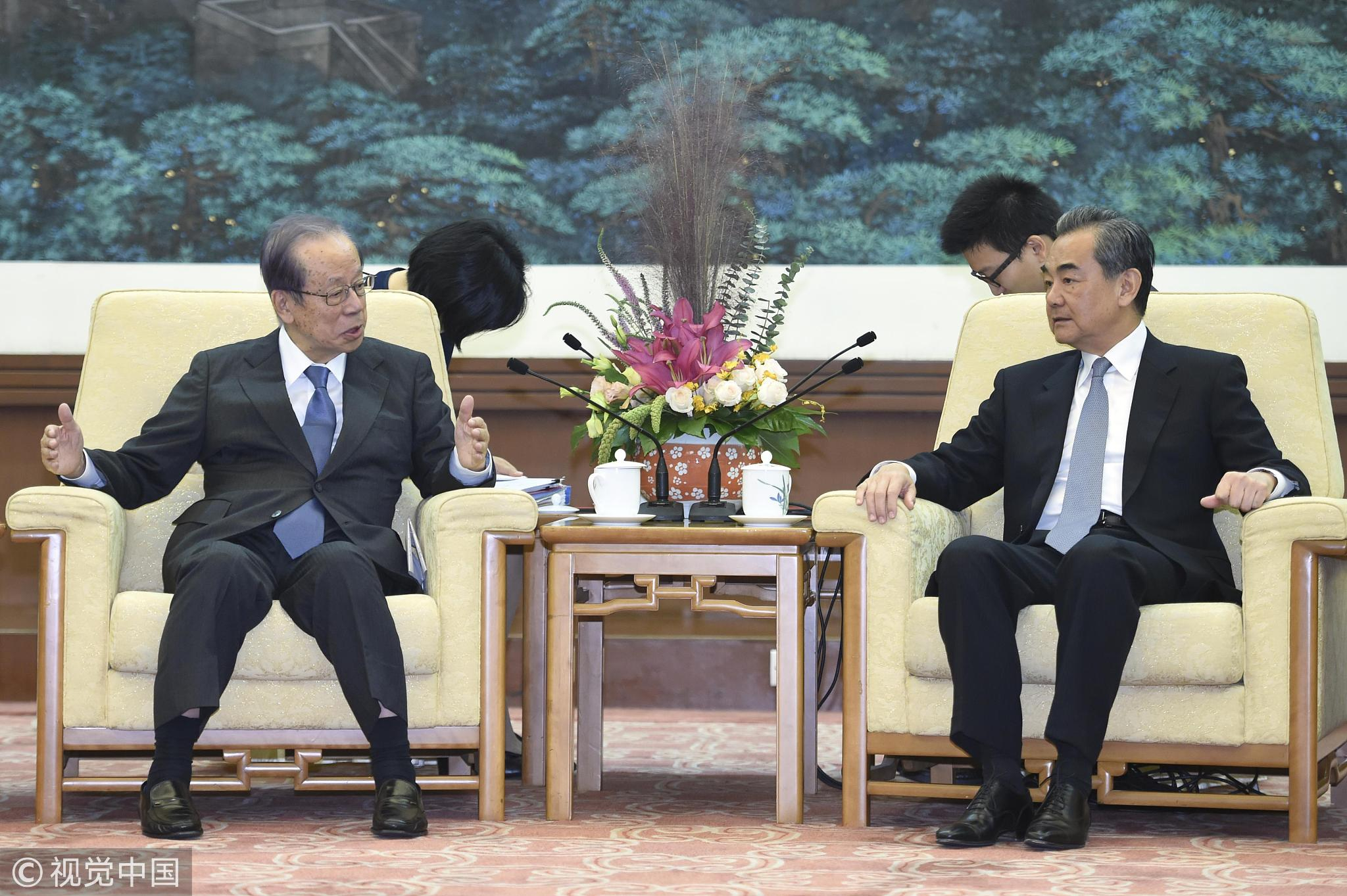 Chinese Foreign Minister Wang Yi (R) and former Japanese Prime Minister Yasuo Fukuda talk at the Great Hall of the People in Beijing on October. 10, 2018. /VCG Photo