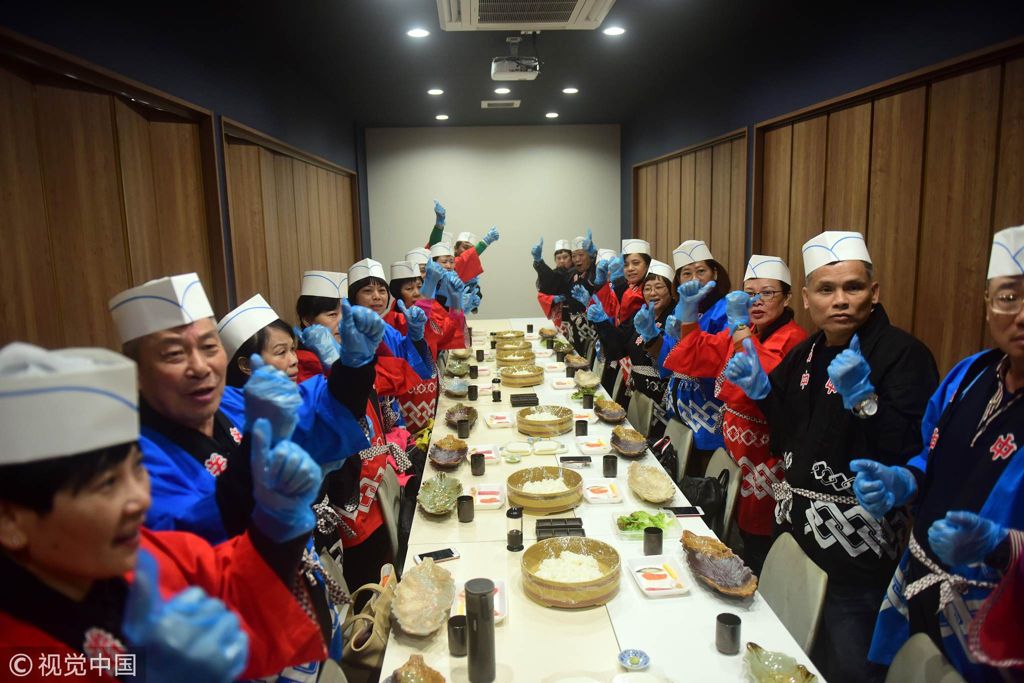 Chinese tourists learn how to make Japanese Sushi in Kyoto, Japan on March 21, 2018. /VCG Photo