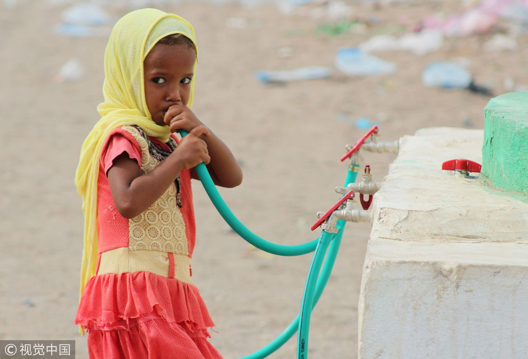 A displaced Yemeni girl drinks water in a camp set up for people who fled the battle areas in the east of the port city of Hodeida, Yemen, September 15, 2018. /VCG Photo