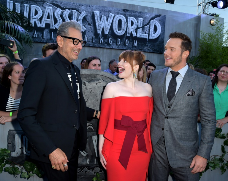 "Jurassic World: Fallen Kingdom," starring (left to right) Jeff Goldblum, Bryce Dallas Howard and Chris Pratt, seen at the film's Los Angeles premiere /AFP Photo