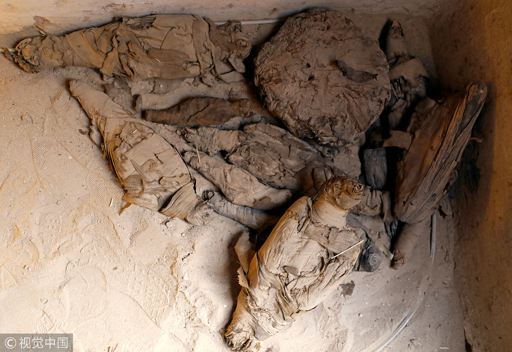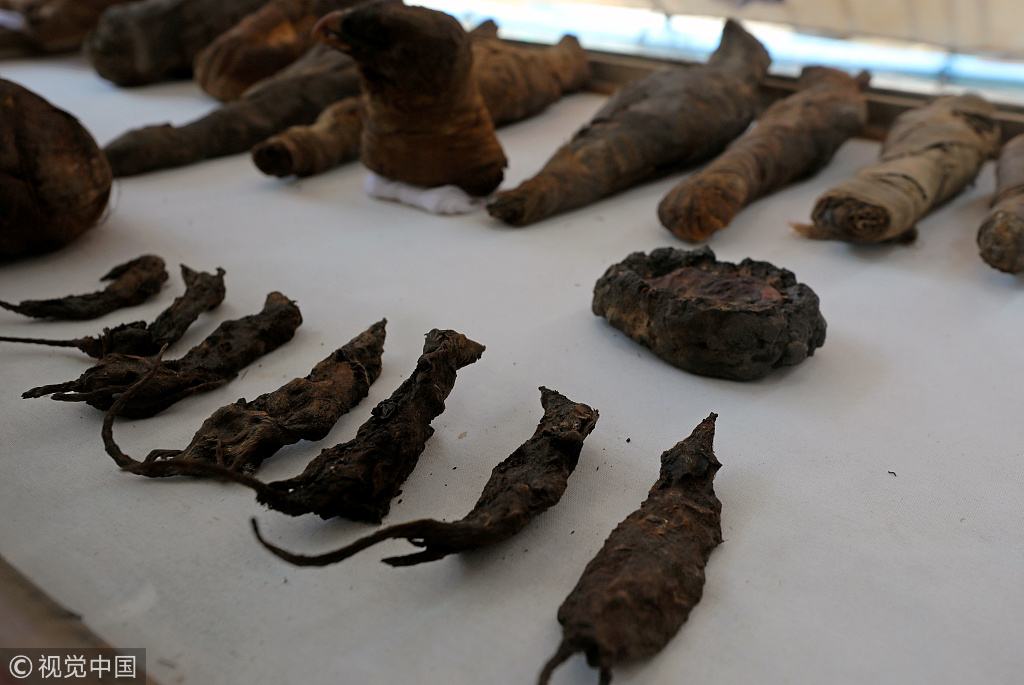 More than 50 mummified mice, mummified falcons and other bird species were discovered in a beautifully decorated 2,000-year-old tomb in the Egyptian town of Sohag earlier last week. / VCG Photo