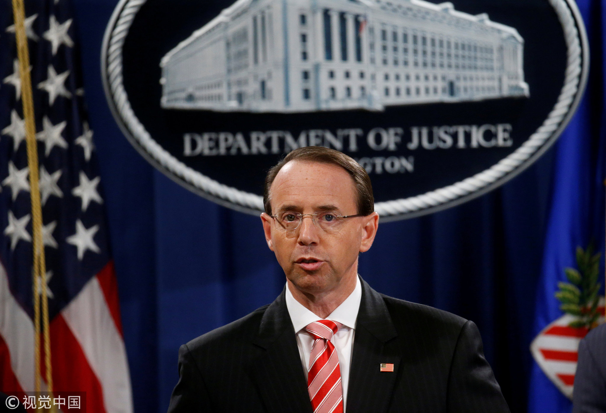 Deputy US Attorney General Rod Rosenstein announces grand jury indictments of 12 Russian intelligence officers in special counsel Robert Mueller's Russia investigation, during a news conference at the Justice Department in Washington, US, July 13, 2018. /VCG Photo