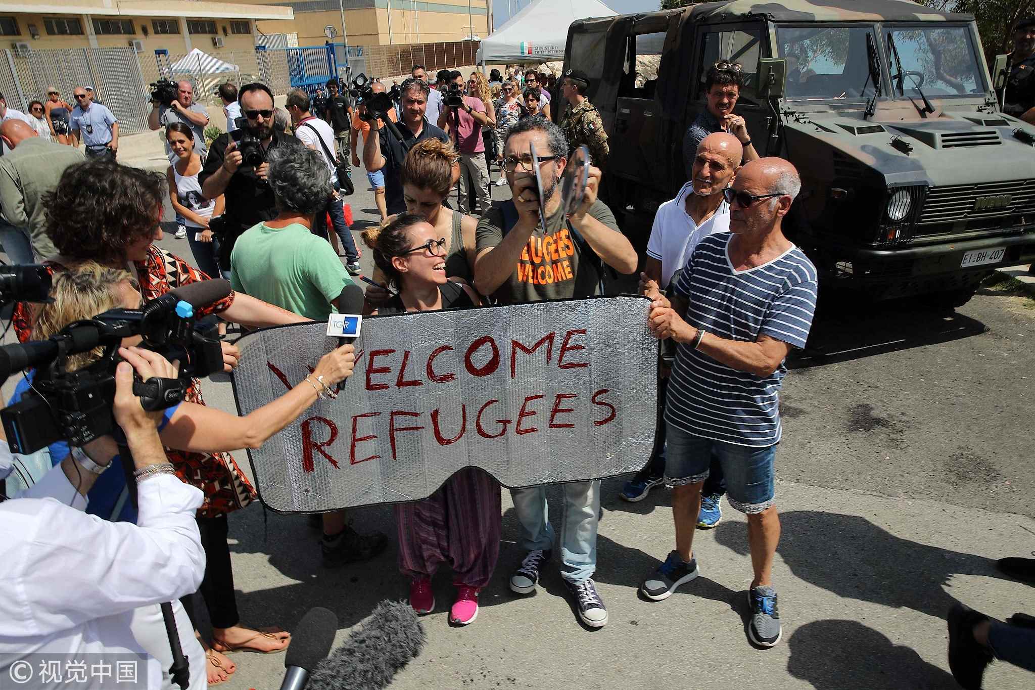 People hold a placard reading "Welcome refugees" as they protest against the visit of Italy's new hardline Interior Minister at the reception center (CPSA) in Pozzallo, Sicily, June 3, 2018. /VCG Photo