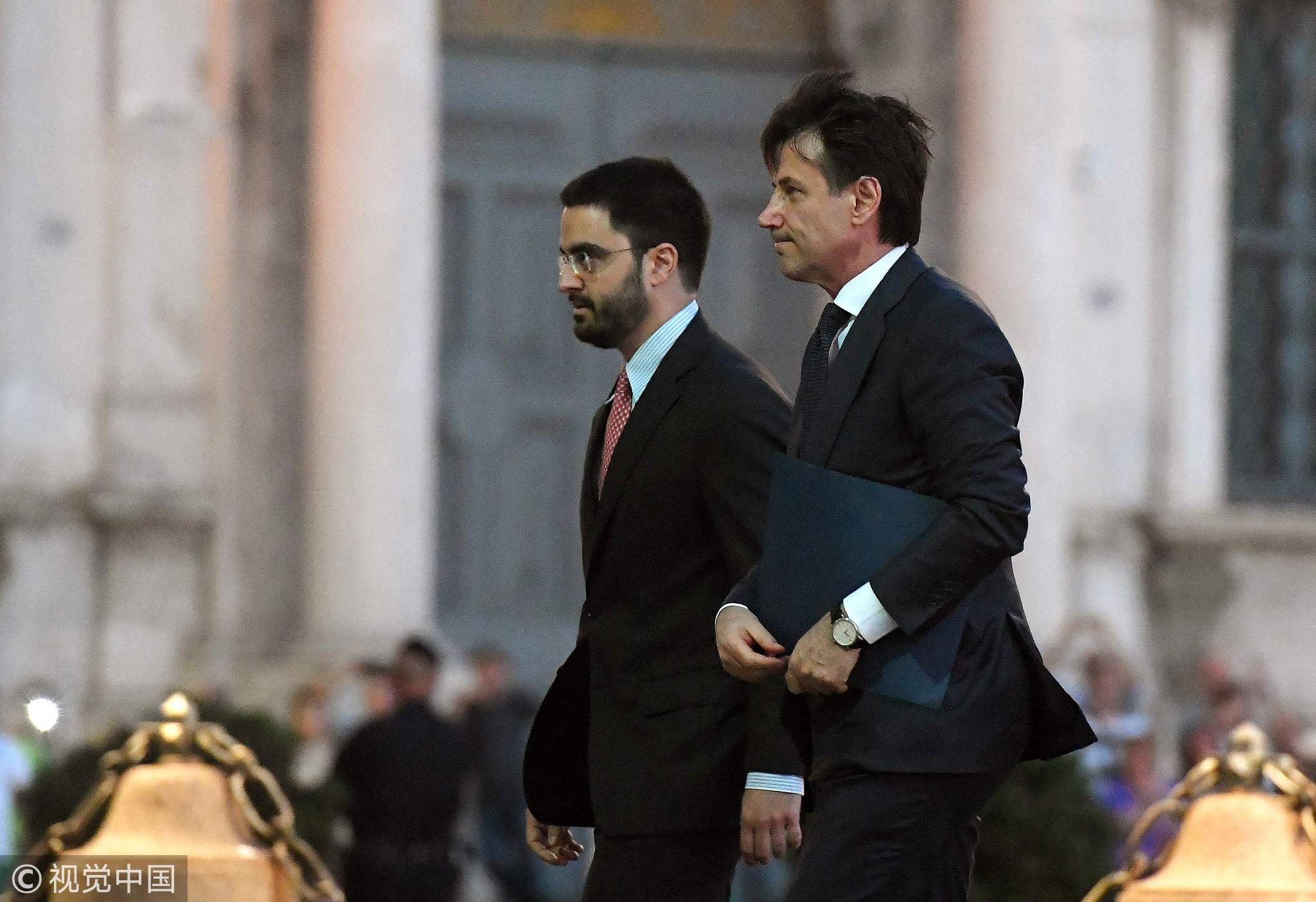 Italy's Prime Minister candidate Giuseppe Conte (R) arrives at the Qurinale presidential palace, May 31, 2018, in Rome to meet Italian President about a mandate to form a government for the second time. /VCG Photo