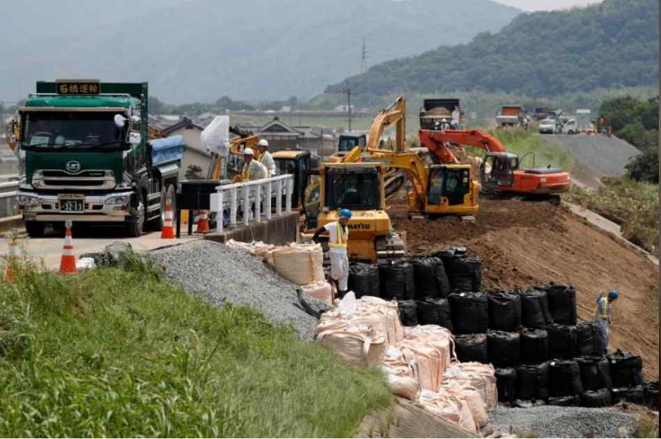 Workers conduct repair work on a destroyed embankment along Odagawa river in Mabi town, July 13, 2018. /Reuters Photo