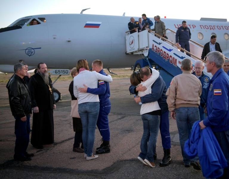 NASA astronaut Nick Hague and Russian cosmonaut Alexey Ovchinin were greeted by family members and officials after landing in Kazakhstan. /AFP Photo